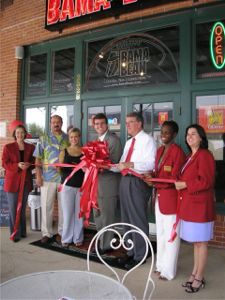 At 2 p.m., Johnna Hold and Bama Bean, located on Fourth Street behind The Chamber offices, celebrated their first year in business with refreshments for visitors and a cutting of the ribbon by Mayor Walt Maddox. Left to right in the photo are Angie Askew of Morgan Keegan, Chamber Ambassador; Mike Elmore, Johnna's father; Johnna; Mayor Maddox; Chamber President Johnnie Aycock; Karen Thompson of Temporary Emergency Services, a Chamber Ambassador, and Lachelle Koon of Sheila's Gift Baskets and Gifts, also an Ambassador.