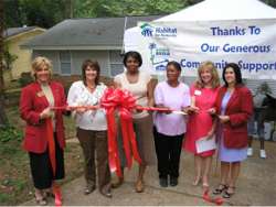 At 5:30 later in the day, Habitat for Humanity held a ribbon-cutting ceremony for two homes that volunteers recently completely remodeled. At this event, it was the mayor's wife, Robin Maddox, who cut the ribbon, again with the help of Chamber Ambassadors.