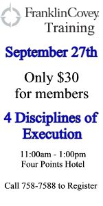 The first "Lunch and Learn" workshop is set for September 27 at the Sheraton Four Points Hotel, 11 a.m. until 1 p.m. Over lunch, attendees will get a two-hour overview of the methodology of the four basic disciplines for leaders, managers, and front line workers in order to translate their high level goals into action-oriented steps. This helps insure that the entire team is aligned and executing the team's most important goals.