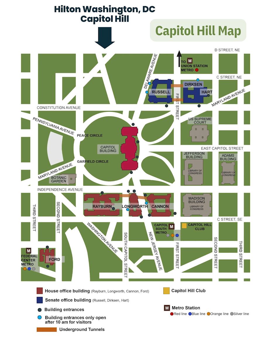 The Hilton Capitol Hill is walkable to Congressional Buildings! It's about 0.6 miles to the Senate buildings (15-minute walk) and 0.9 miles to House buildings (20-minute walk). Bring your walking shoes! If you'd rather not walk, taxis/Ubers/Lyfts are readily available.