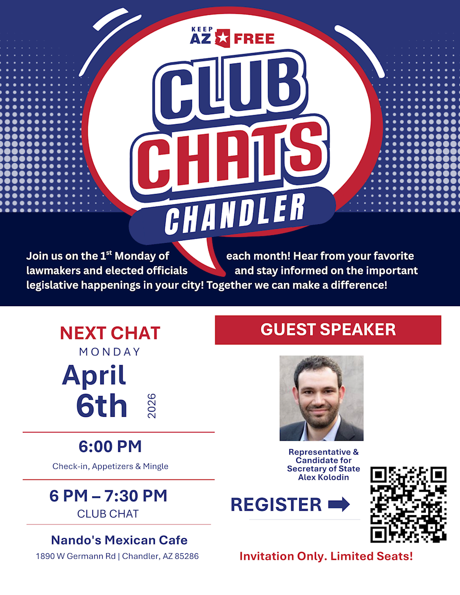 The AZ Liberty Network, a coalition partner to the AZ Free Enterprise Club, invites you and your friends and family to the Keep AZ Free Club Chat - Chandler!
