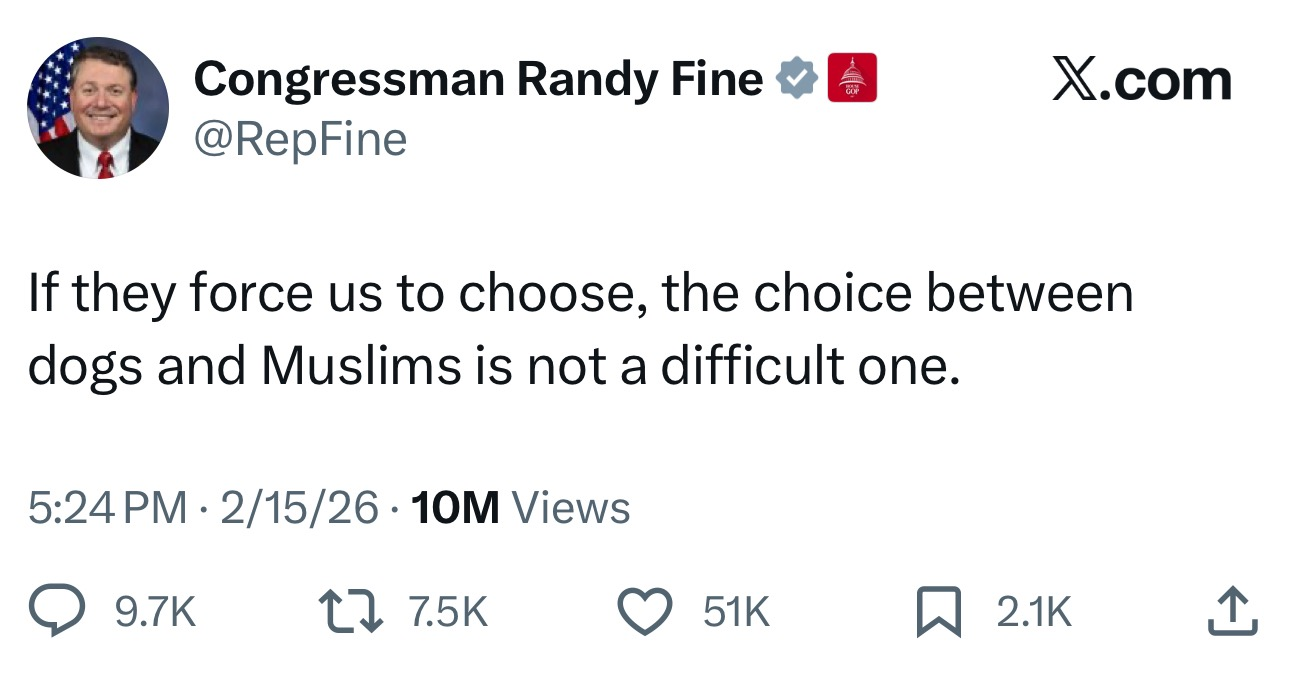 Members of Congress are elected to serve all Americans, not to spread hate or normalize bigotry. Representative Fine’s ongoing attacks betray that duty, and his party’s refusal to act makes them complicit. With the creation of the Sharia Free America Caucus, the GOP is actively enabling and platforming this hate.