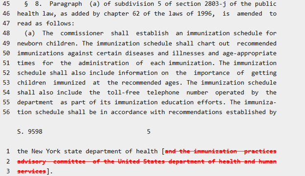 Section 8 of the bill (see below) will give the New York State Commissioner of Health, who answers to the Governor, the power to create the vaccine schedule for “newborns” with no oversight from any the medical or governing institutions.